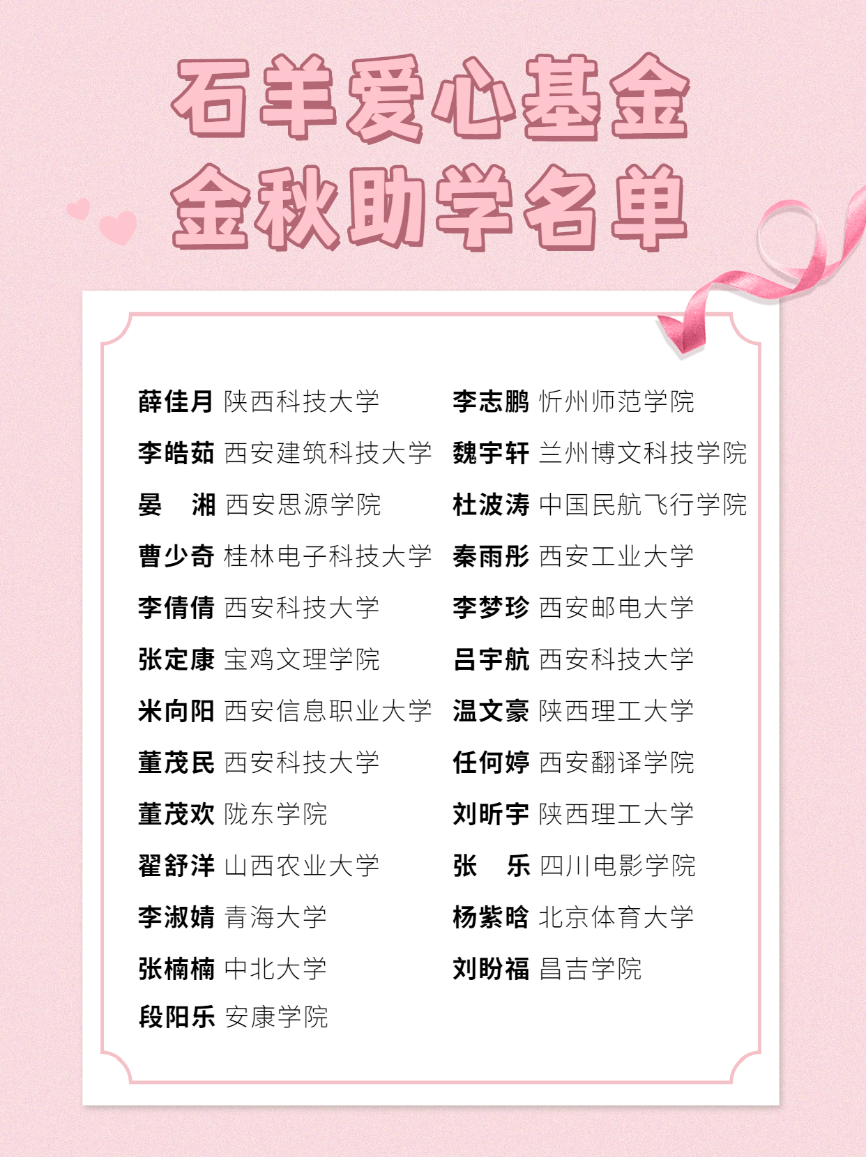 一年一度的石羊愛心基金“金秋助學”活動在西安邦淇公司拉開帷幕,經愛心基金管理委員會篩選審核,本年度為25名困難員工子女及上下游困難客戶子女發放助學金101000元。